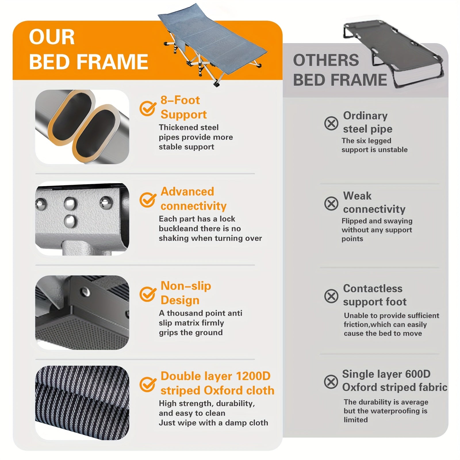 What sets our Oversize XXL Folding Camping Cot apart from typical cots is its robust construction combined with its spacious design. Most camping cots fall short on weight capacity or comfort, but our product delivers both, ensuring you can relax and enjoy your time outdoors without compromise.